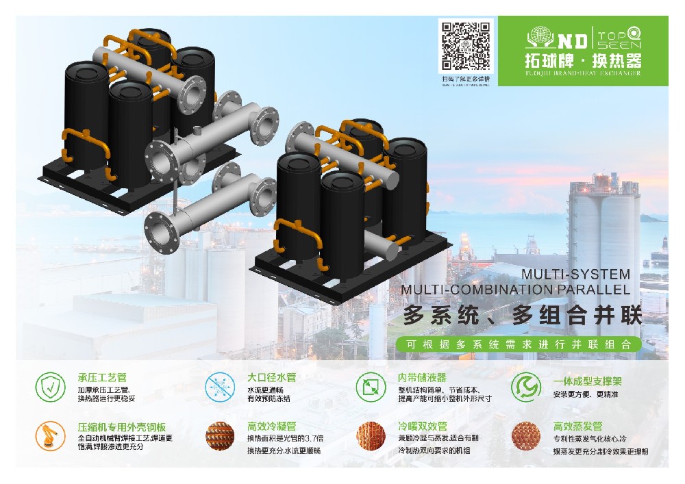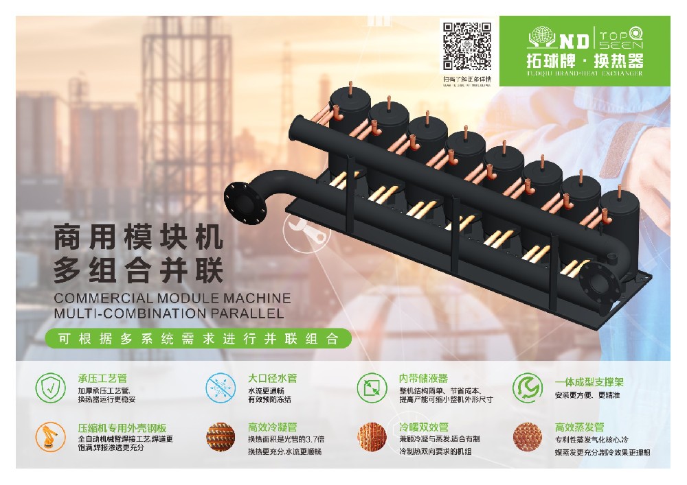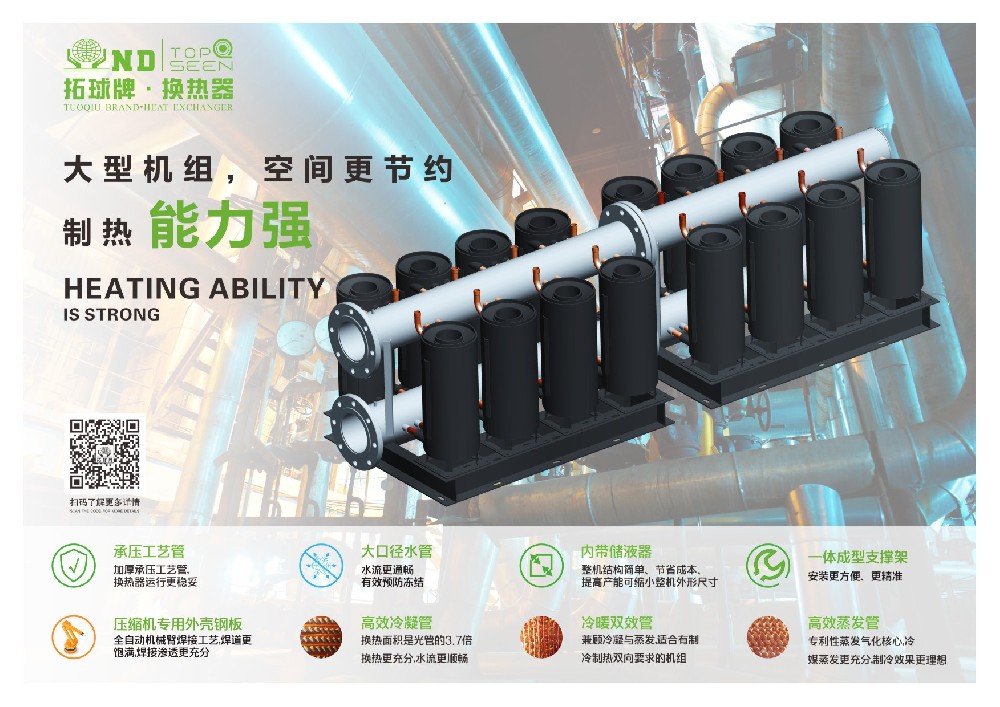 应用面广●煤改电变频机组首选型号。●累计销量超过200000台。●快装结构方式,安装简便节省人工成本。换热效率高●盘管采用高效翅片管,换热面积为光管的3.6倍。●铜管内外表面的翅片使制冷剂与冷却水高速紊流,有效提高换热效率。●盘管紧凑的螺旋结构保障制冷剂能充分换热。使用安全●整体铜管没有内部焊点,确保系统稳定...