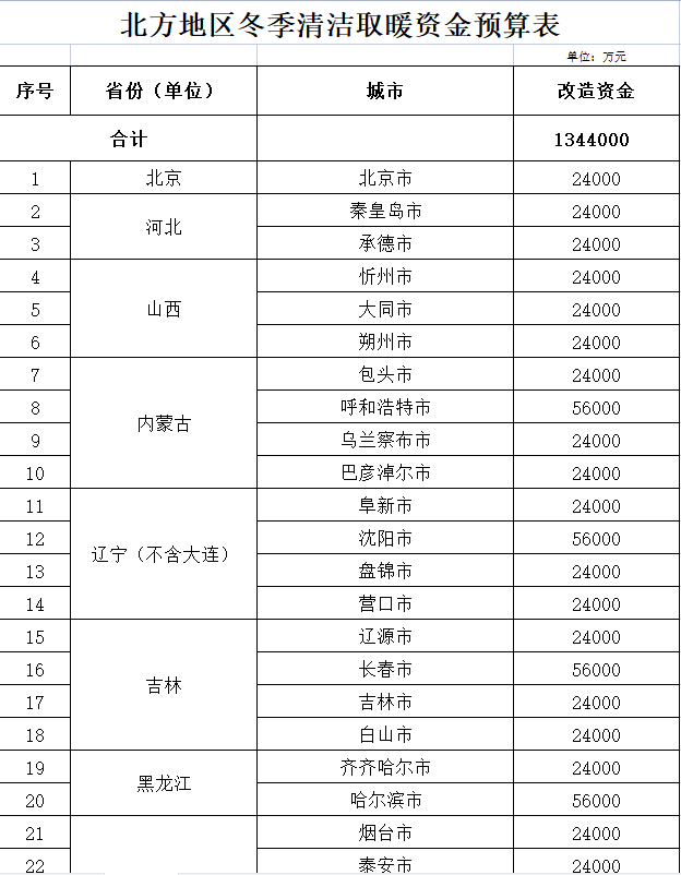 二、北方地区冬季清洁取暖资金额度详见附件2、3。请相关省抓紧拨付资金,会同有关部门督促相关城市积极稳妥地做好清洁取暖工作。