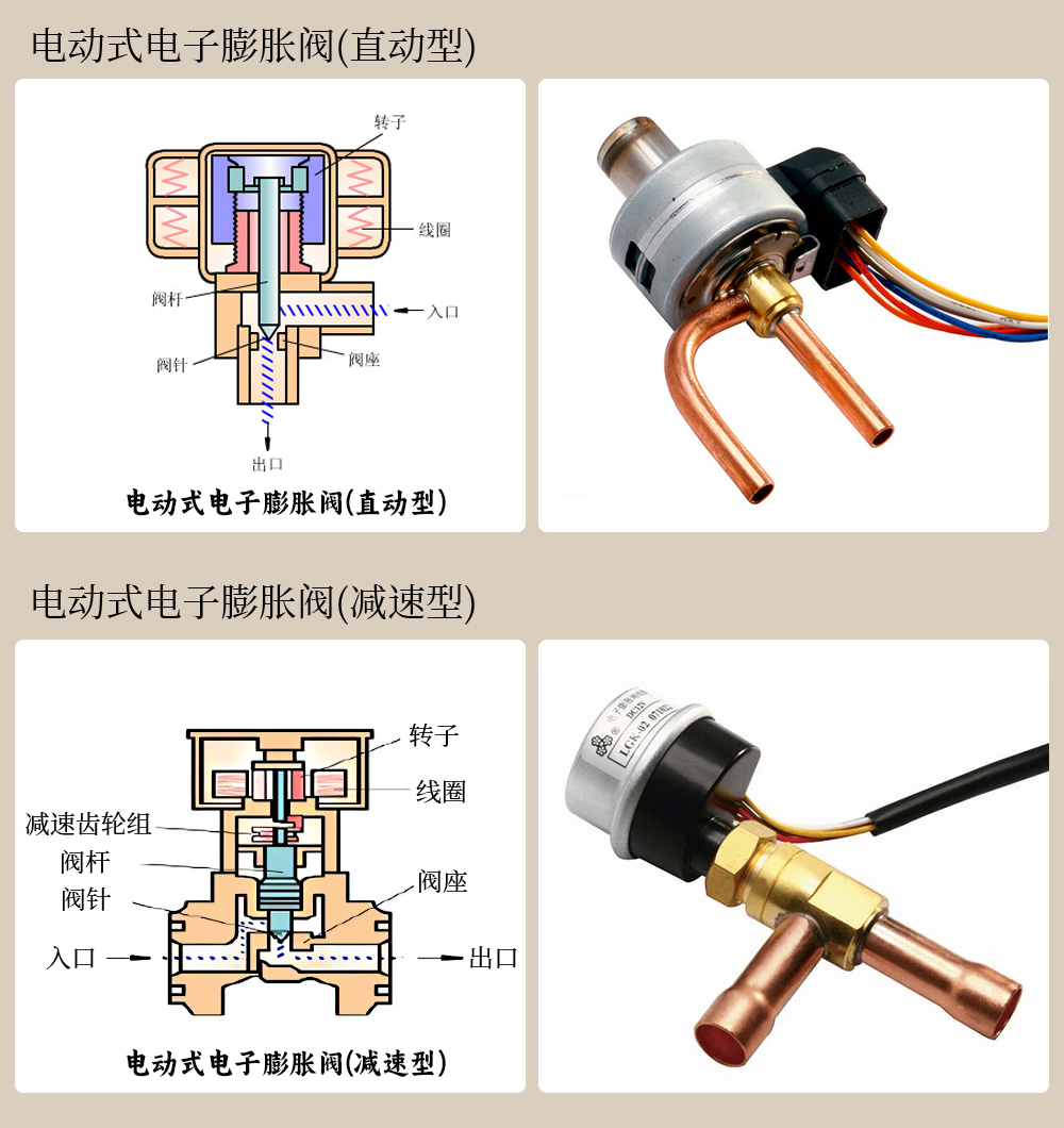 步进电机直接带动阀针的是直动型,步进电机通过齿轮组减速器带动阀针的是减速型。电动式电子膨胀阀采用电机直接驱动轴,以改变阀的开度。