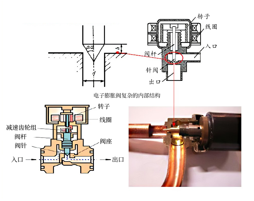电动式电子膨胀阀接受由微型计算机传来的运转信号进行动作,根据运转信号,驱动部的转子回转,以螺旋将其回转运动转换为轴的直线运动,以轴端头的阀针调整节流孔的开口度。