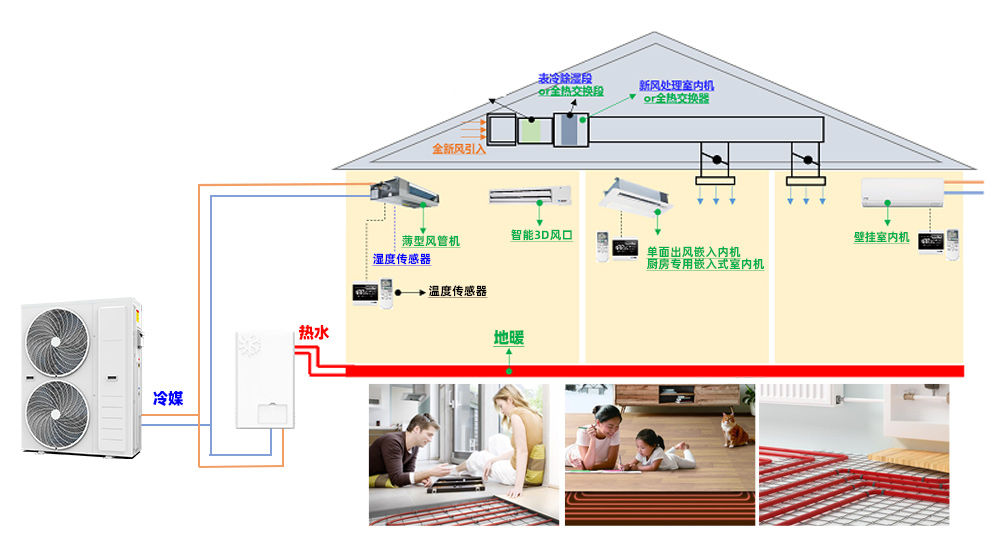 两联供系统有制冷跟制热系统,冬季供暖要把制冷模式切换到制热模式,风盘模式切换到地暖模式