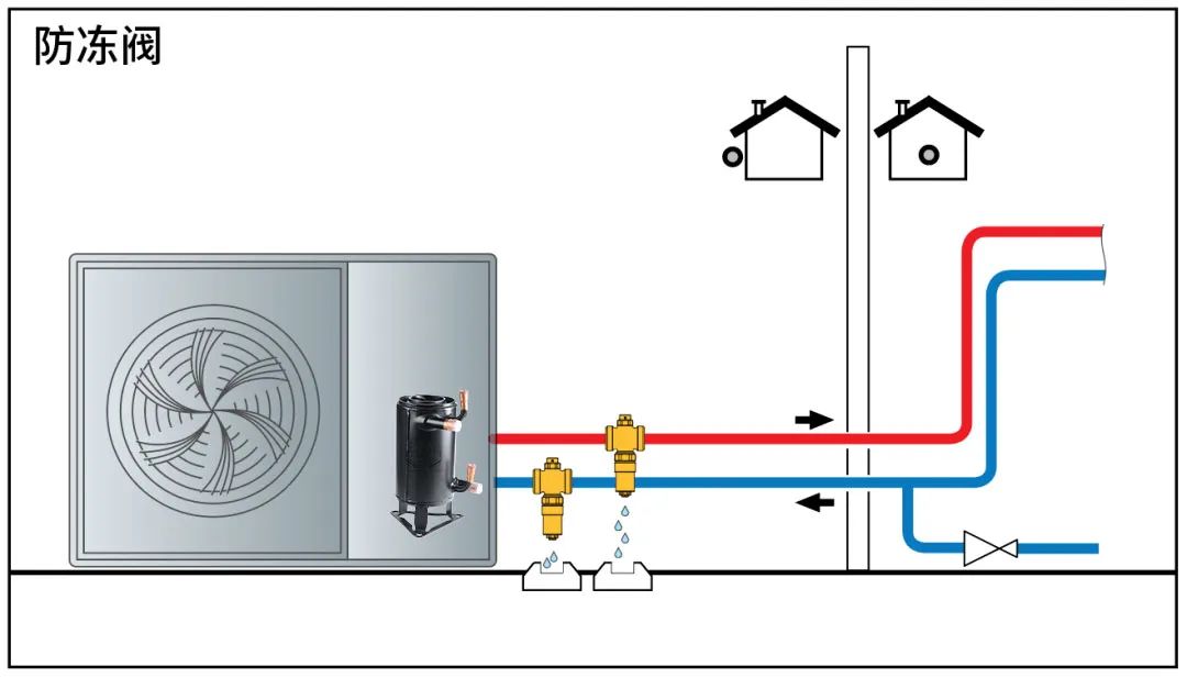 防冻阀一个在热泵系统中经常被忽视的防护元件,但是遇到寒冷地区它的作用就是至关重要的,当热泵运用于寒冷地区时,暴露在室外的管道可能会结冻的几率,一旦出现这种情况,会对主机和系统造成很大的损失,它往往在以下几个问题同时出现时产生:
