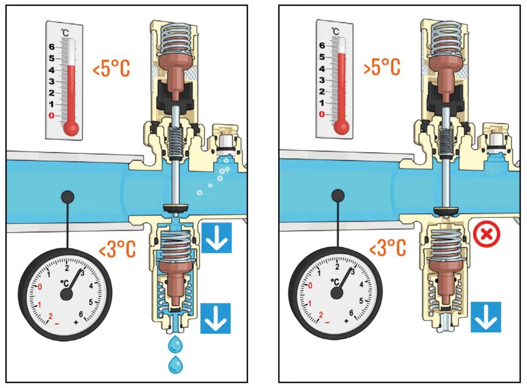 当阀体内的水温低于3℃时,感温元件自动开启泄水活塞泄水。当水温超过4℃时,泄水活塞自动关闭,停止泄水。