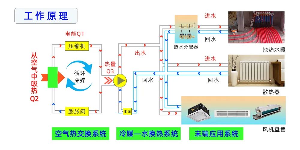 空气源热泵应用热泵技术,冬天以极少的电能驱动压缩机运转,吸收空气中大量的低温热能并转变为高温热能,产生不超过55度的热水,并作为热媒在地暖专用管道内循环流动,通过地面辐射和对流的传热使地面升温达到采暖效果。