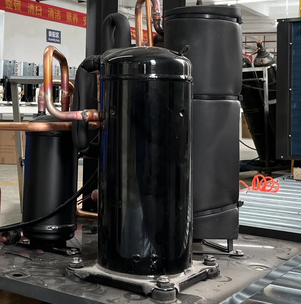 考虑到大型空气能机组在运输过程中为了减少运输过程中压缩机震动导致对铜管产生伤害,会将压缩机用固定螺丝牢牢钉住,加强固定,所以运输到达目的地时就可以将压缩机固定螺丝的松紧度稍微调松一点,让压缩机处于比较松弛的状态进行工作,减少震动传递到支架上。