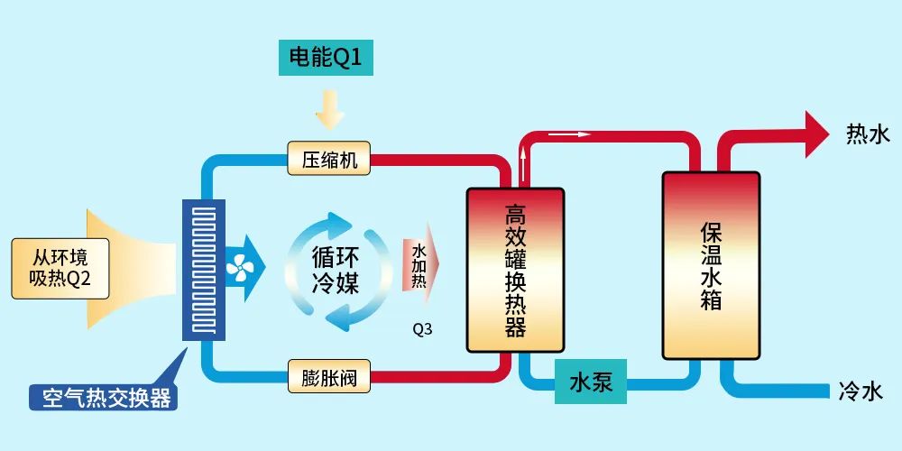 逆卡诺循环:通过压缩机做功,使工质(制冷剂)产生物理变相(气态--液态--气态),利用这一往复循环相变过程不断通过蒸发器吸热和冷凝器放热,由吸热装置吸取外界热量,经过热交换器使冷水升温,制取的热水通过水循环系统送至用户。