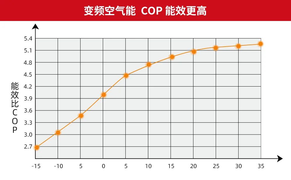 在常温下,定频空气源热泵和变频空气能的制热能效相差不大,但是温度越低,差距就越明显。