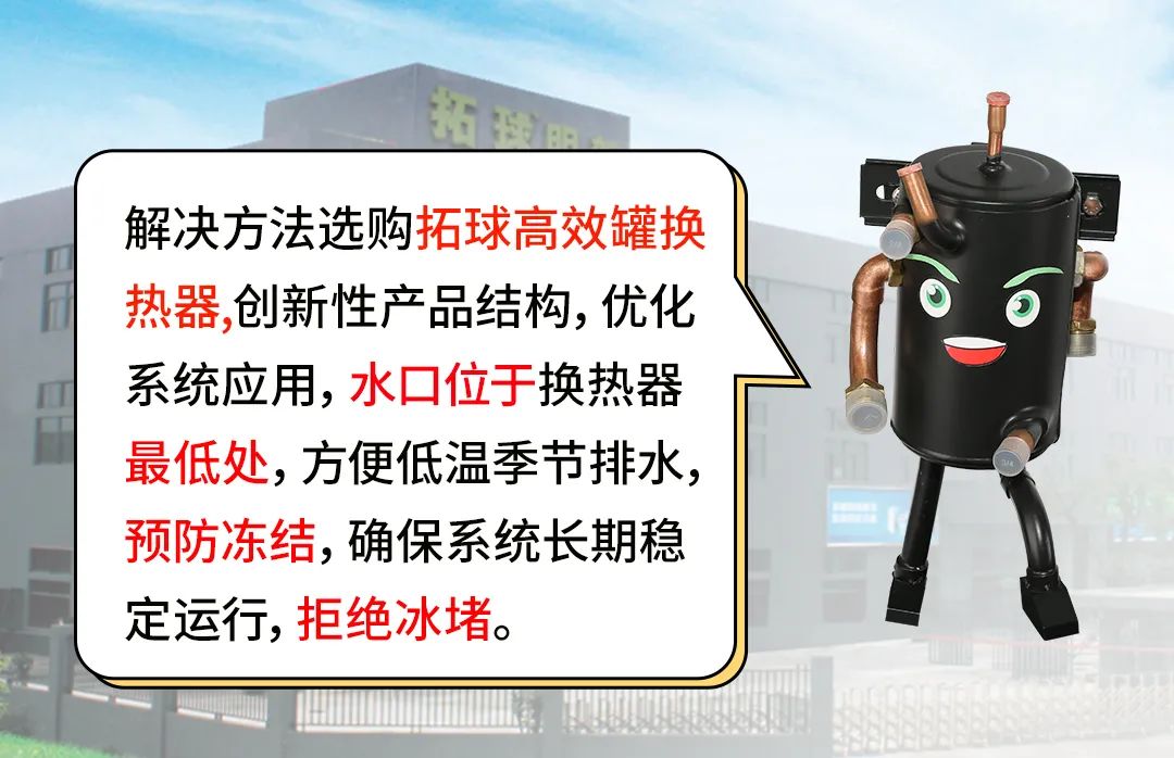换热器冰堵问题: 当换热器充当冷凝器时,应对温度过低情况下,如果停机后排水不彻底留有余量时,则会结冰,在下次开机的时候,会发现水流不畅通甚至无水流通过,热泵机组系统会高压报警,当换热器充当蒸发器时,因接管不当或低压压力过低导致运行结冰,这时热泵机组系统低压也会同样做出警报。