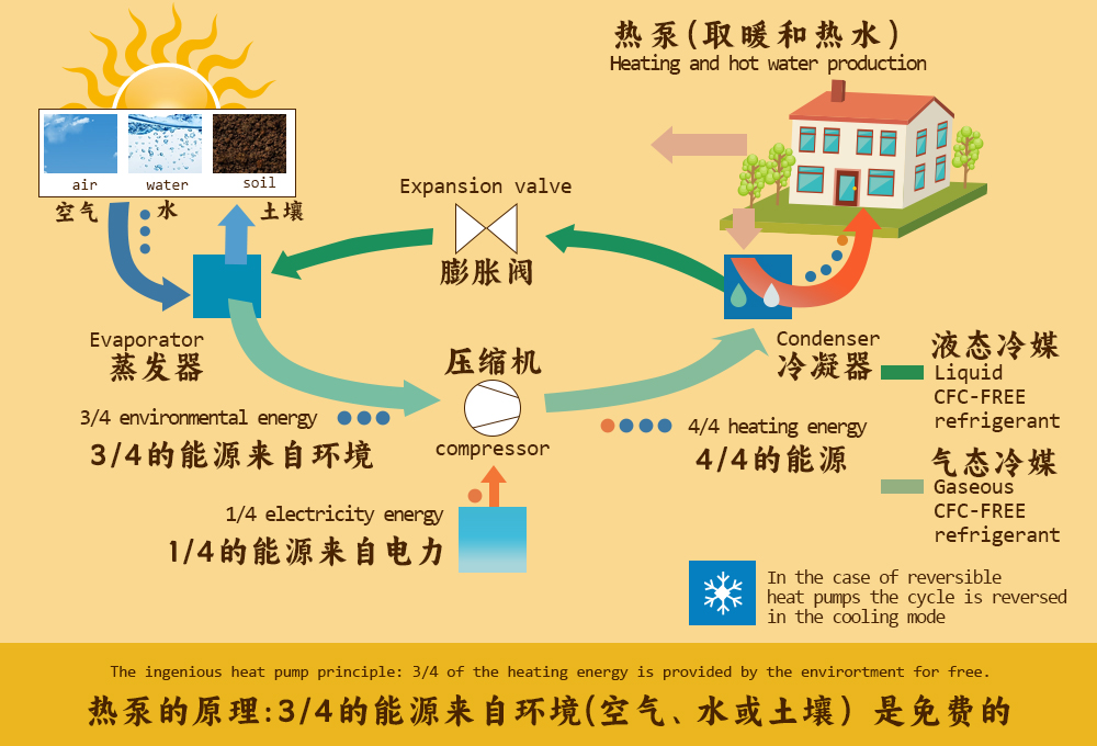 空气能热泵“地暖空调”一机两用,夏季作为空调冷源、冬季作为地暖系统的热源,清洁无污染,用户无需额外购买制冷、制热设备。