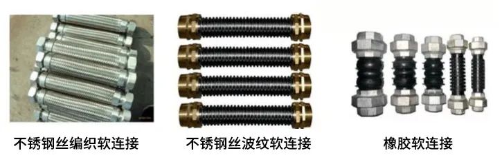 可采用不锈钢波纹管或不锈钢丝扣软管,软连接的管口尺寸和主管路的管径要一致,不能用小的代替大的,大的代替小的。